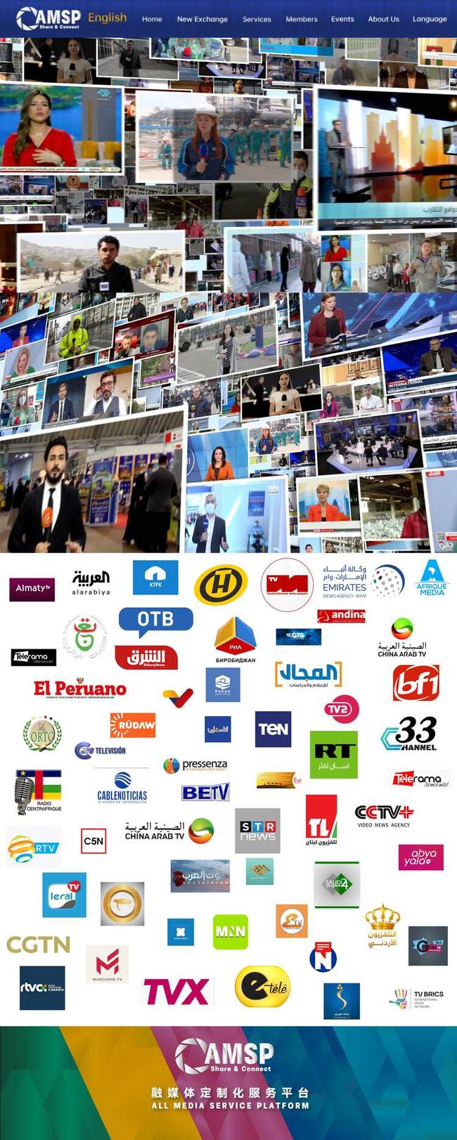 Platforma All Media Service (AMSP) a fost lansată luni, la inițiativa China Media Group (CMG) și a partenerilor globali de presă. Este vorba despre o platformă de servicii interactive de publicare de informații, schimburi de conținut și personalizarea cooperării dintre instituțiile media din lume. AMSP va avea 500 de canale media internaționale, care vor oferi informații în format video în limbile engleză, franceză, spaniolă, rusă și arabă.