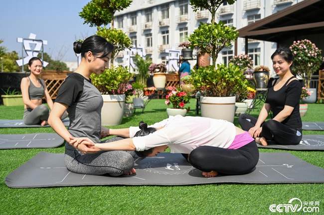 Membrele echipajului de pe trenul de mare viteză din secțiunea Chongqing practică yoga în centrul pentru divertisment al sindicatului.