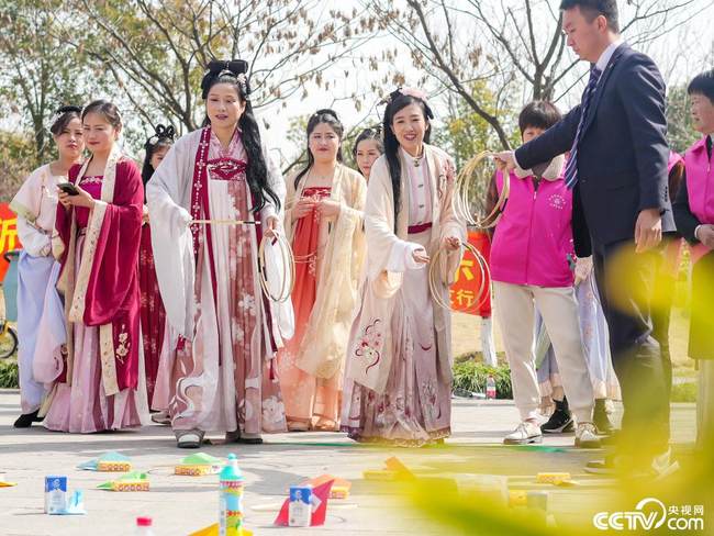 În 7 martie 2022, în orașul Huzhou, provincia Zhejiang, femeile poartă Hanfu și se joacă cu un cerc.