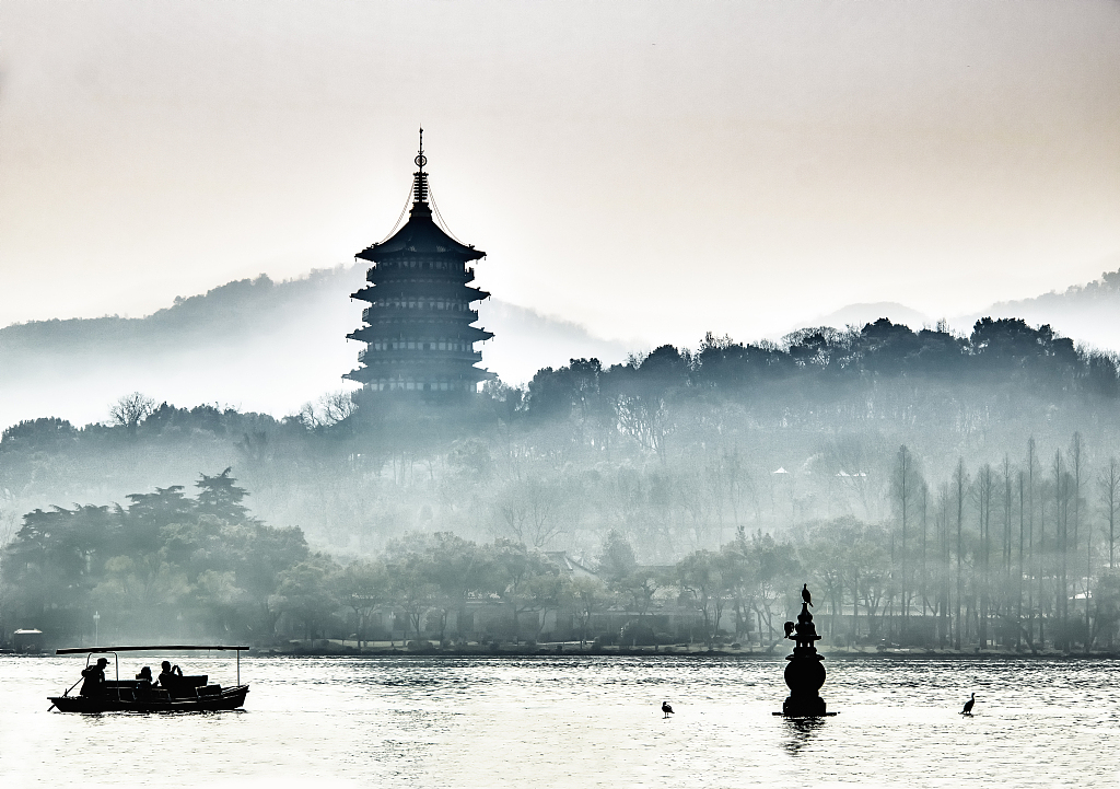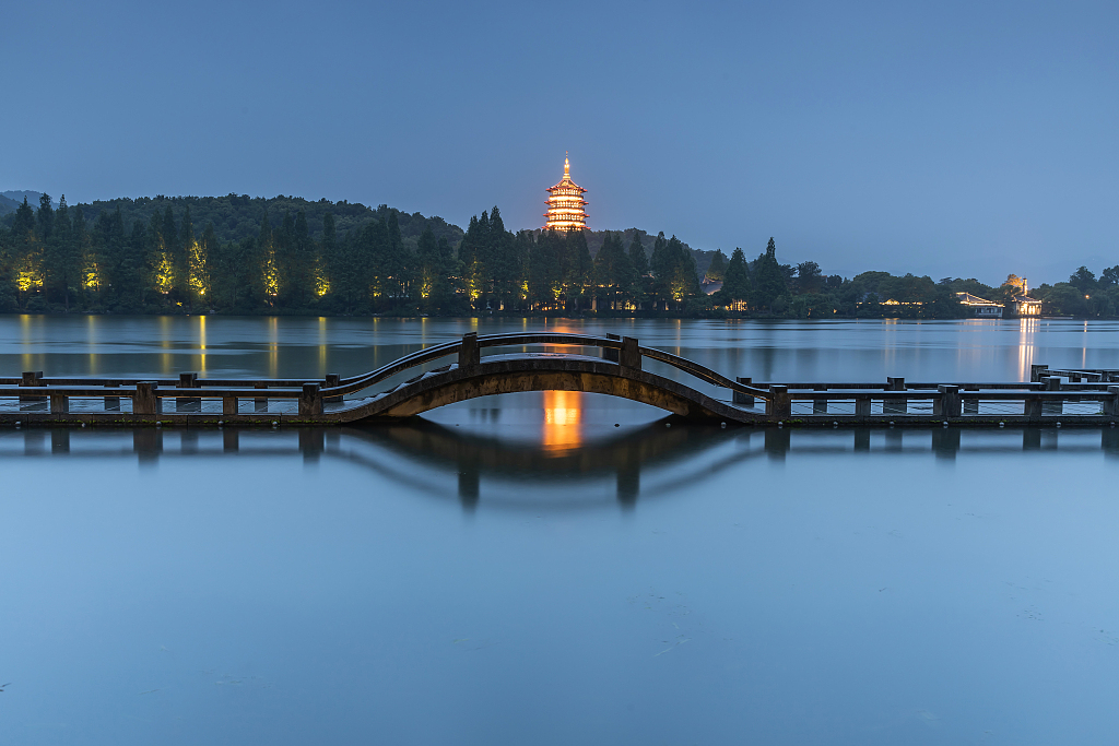 Pe partea de sud a Lacului de Vest, Pagoda Leifeng este considerată structura pitorească de top din jurul lacului datorită siluetei sale uimitoare la strălucirea serii.