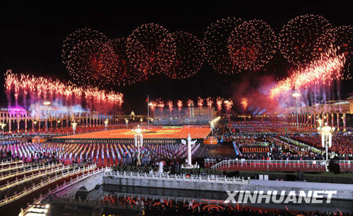 În parada militară ce a avut loc ulterior, 14 detaşamente de soldaţi, 30 de echipe de echipamente şi 12 formaţii eşalonate de avioane ale Armatei Populare Chineze de Eliberare au fost trecute în revistă. În demonstraţia populaţiei, dispozitivul de defilare este constituit din 100.000 de oameni, 36 de blocuri de paradă formate din 60 de care alegorice şi formaţiuni de reprezentare artistică.