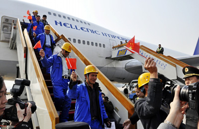 Echipa de lucru trimisă de guvernul chinez pentru retragerea cetăţenilor chinezi din Libia şi-a încheiat misiunea şi s-a întors sâmbătă dimineaţă la Beijing. La bordul a două avioane se află şi cetăţeni chinezi retraşi din Tunisia şi Grecia, în total 778 de persoane.