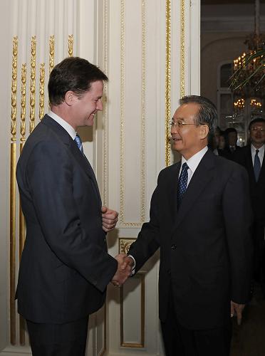 Wen s-a întâlnit, în aceeaşi zi, la Londra, cu vicepremierul britanic, Nick Clegg şi cu reprezentanţi din domeniul economic. Demnitarul chinez a arătat că cele două ţări vor putea acorda importanţă cooperării în domeniul economiei ecologice, bucurându-se de avantaje diferite, pentru realizarea dezvoltării sustenabile şi pentru a aduce contribuţii la redresarea economiei mondiale şi la contracararea schimbărilor climatice.