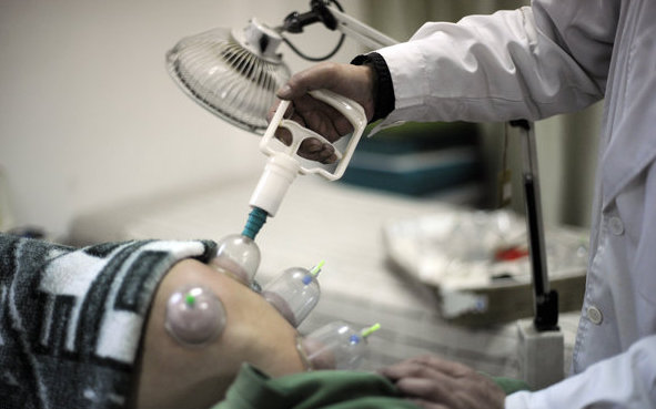 Ding Chongjiu tratează un pacient folosind ventuze. Chongqing, sud-vestul Chinei, 06 martie . [Photo/CFP]