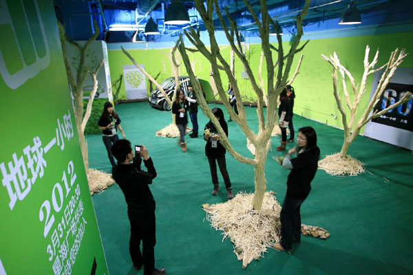 Voluntarii crează copaci artificiali din beţişoare reciclate în Dalian, provincia Liaoning din nord-estul Chinei, 11 martie 2012. Copacii din beţişoare sunt făcuţi pentru a marca participarea Dalianului la Ora Pământului 2012, un eveniment global dedicat mediului, organizat de World Wildlife Fund (WWF). (Xinhua)