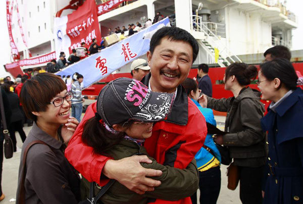 Unul din membrii navei de cercetare Xuelong sau Dragonul Zăpezii, Xu Wenqiang este întâmpinat la sosire, la baza din estul municipiului Shanghai, 8 aprilie 2012. Nava de cercetare tocmai s-a întors în China, după ce şi-a încheiat cu succes cea de-a 28-a expediţie ştiinţifică din Antarctica. Echipajul a călătorit 28 de mii de mile marine în cinci luni şi a realizat 47 de sarcini în timpul expediţiei. (Xinhua)