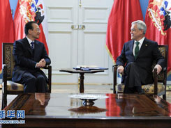 Premierul chinez Wen Jiabao a avut, marţi, la San Diego convorbiri cu preşedintele statului Chile, Sebastian Pinera. Cele două părţi au anunţat stabilirea relaţiilor de parteneriat strategic, încheierea unor negocieri în domeniul investiţiilor legate de articolele din tratatul bilateral privind comerţul liber. Cei doi au convenit să constituie un mecanism de cooperare interguvernamentală şi să înceapă să întocmească un program comun de acţiune.
