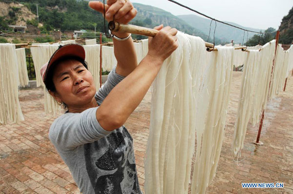 Un muncitor aeriseşte producţia de fidea din orez în judeţul Qingjian, provincia Shaanxi din nord-vestul Chinei. Producţia de fidea a devenit o industrie pilon în judeţ, cu o valoare anuală de peste 120 milioane de yuani (18,876 milioane de dolari). (Xinhua/ Li Yibo)