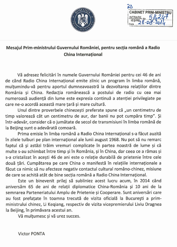 La aniversarea celor 46 de ani de emisie în limba română la Radio China Internaţional, premierul României, Victor Ponta, Ministerul Afacerilor Externe de la Bucureşti, Ambasadorul Republicii Moldova în R.P. Chineză, Anatol Urecheanu, foşti diplomaţi şi o serie de prieteni ai secţiei române au transmis mesaje de felicitare.