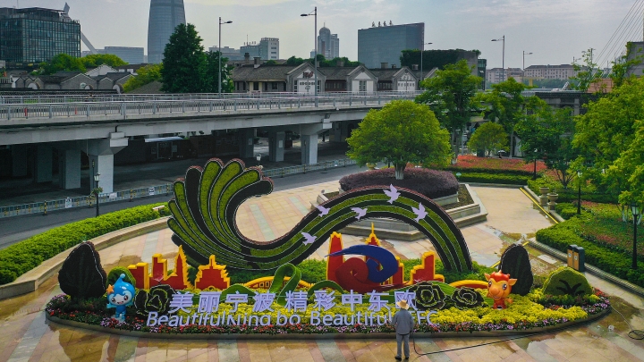 De câteva zile piețele, parcurile și cartiere culturale din orașul Ningbo, provincia Zhejiang, au fost amenajate cu flori, sculpturi din plante și cu mascotele Expoziției China – ECE, Tuowa și Haiwa.