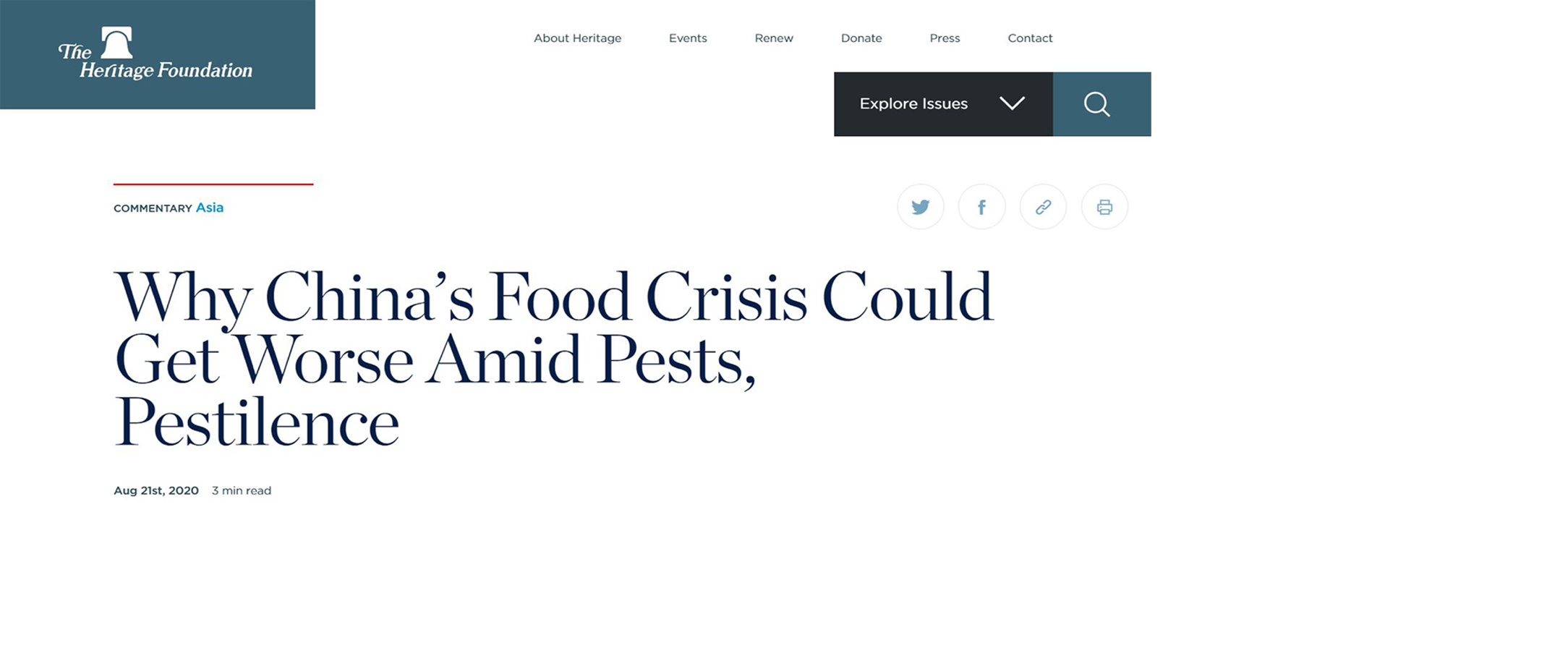 China obține recolte bune an de an, iar rezervele de cereale sunt suficiente timp de peste un an. Potrivit standardului internațional, dacă ponderea dintre rezerva și consumul de cereale se menține între 17% și 18%, situația alimentară este sigură. China este peste nivelul acestei limite de securitate internațională.