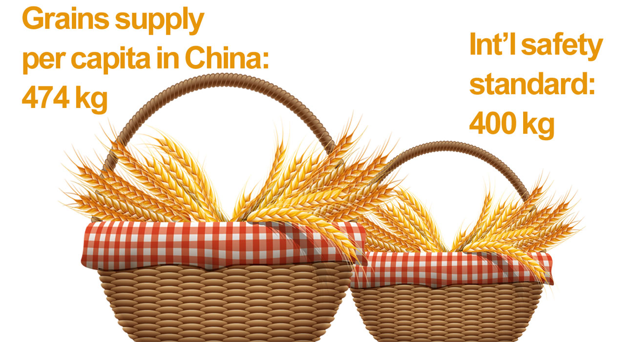 China obține recolte bune an de an, iar rezervele de cereale sunt suficiente timp de peste un an. Potrivit standardului internațional, dacă ponderea dintre rezerva și consumul de cereale se menține între 17% și 18%, situația alimentară este sigură. China este peste nivelul acestei limite de securitate internațională.