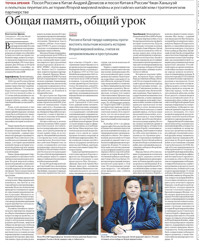 Ambasadorul Chinei în Rusia, Zhang Hanhui, și omologul său în China, Andrey Denisov, au publicat miercuri un articol la împlinirea a 75 de ani de la victoria obținută în Războiul poporului chinez împotriva agresiunii japoneze și Războiul Mondial antifascist. Conform celor doi ambasadori, marile sacrificii și contribuții aduse de popoarele chinez și rus trebuie respectate și rememorate, fără a fi denaturate. China și Rusia protejează rezultatele victoriei celui de-al Doilea Război Mondial, susțin și pun în practică multilateralismul, fiind dispuse să coopereze pentru menținerea păcii mondiale și dezvoltării globale.