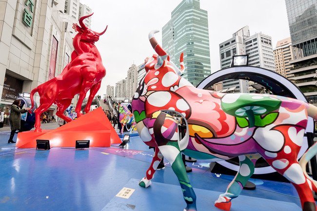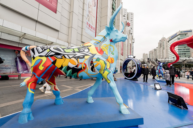 În zona comercială Xujiahui din orașul Shanghai au apărut sculpturile colorate a cinci tauri din fier, care trimit binecuvântări de Anul Nou Chinezesc locuitorilor și atrag numeroși vizitatori. (via IC Photo)