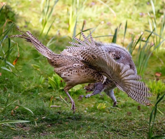 În Marea Britanie, fotograful Ivor Ottley a surprins cu aparatul foto o bătaie între o veveriţă şi un fazan, în grădina din spatele casei sale. Veveriţa a atacat piciorul fazanului, în timp ce acesta o lovește cu ciocul pe veveriţă. Imaginea pare desprinsă dintr-un film de acţiune.