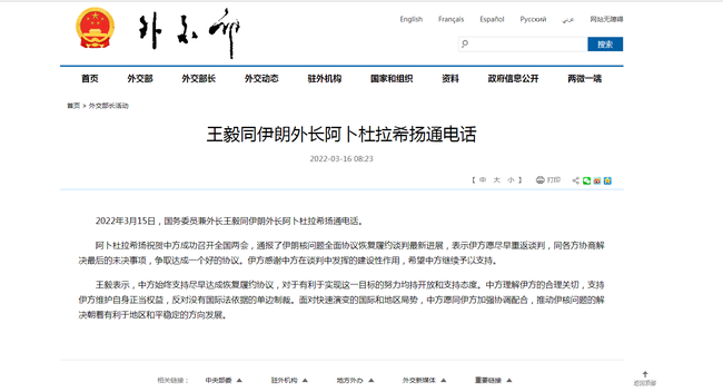 Șeful diplomației iraniene a felicitat China pentru desfășurarea cu succes a celor două sesiuni anuale, l-a informat pe Wang Yi despre progresele făcute în reluarea negocierilor pentru aplicarea acordului cuprinzător în problema nucleară iraniană, arătându-și dorința de a se reîntoarce cât mai curând posibil la masa tratativelor, pentru a discuta cu părțile implicate despre ultimele probleme rămase și a ajunge la un acord optim.