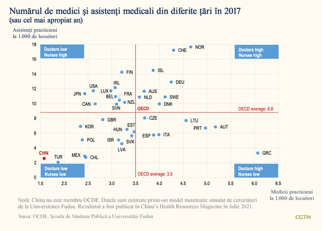Țările care cheltuiesc mult pentru sănătate, precum Norvegia și Elveția, au un număr relativ mare de medici și asistenți. În schimb, China are doar 1,64 medici și 2,54 asistente la 1.000 de locuitori.