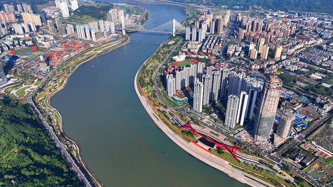 Yibin, cunoscut drept "primul oraș de pe malul Fluviului Yangtze", este locul unde fluviile Minjiang și Jinshajiang se contopesc cu Fluviul Yangtze (Albastru), curgând spre Est.