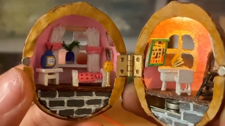 O nucă mică poate fi transformată într-o operă de artă? Acest amator al artei artizanale nu numai că i-a pus nucii ușă și fereastră, dar a și plasat mobilă și tablouri înăuntru. Mai mult, seara, interiorul nucii poate fi luminat, la fel ca o casă adevărată.