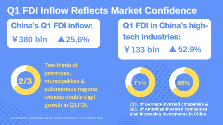 Investițiile străine valorificate în primele trei luni ale anului în curs în China au avut o creștere de 25,6%, totalizând aproape 380 miliarde de yuani. Asemenea creșteri în sectorul serviciilor și industriilor de tehnologii avansate au fost de 17,1 procente, respectiv, 52,9 procente