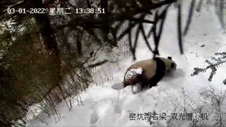 Un urs panda sălbatic se joacă în zăpadă în zona Baishuijiang a Parcului Național al Urșilor Panda. Scena a fost capturată de o cameră de supraveghere cu infraroșu