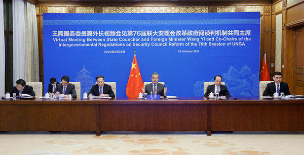 Consilier de stat - ministru chinez de Externe, Wang Yi, a avut marți un dialog în sistem video-conferință cu co-președinții Mecanismului de negociere interguvernamentală privind reforma Consiliului de Securitate a celei de-a 76-a Adunări Generale a ONU