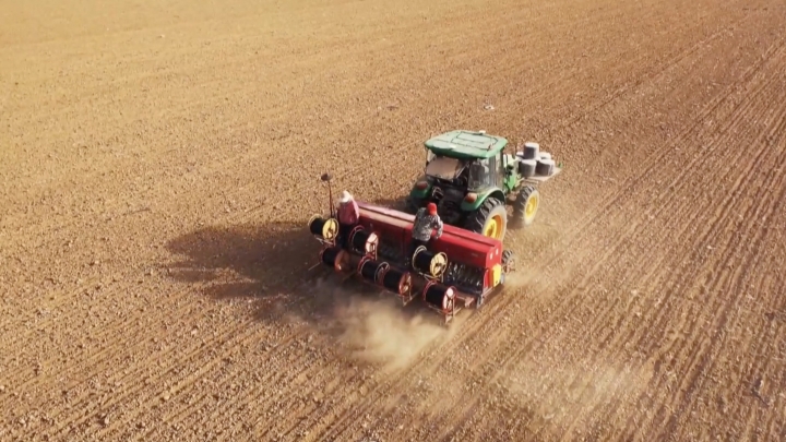 Mașinile de însămânțat fără șofer dotate cu sistemul de navigare Beidou sunt folosite în ținutul Manas din Regiunea Autonomă Xinjiang Uigură pentru asigurarea culturii grâului de iarnă
