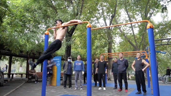 Wang Weitian, de 19 ani, face demonstrații la bara fixă, într-un parc din orașul Xi'an. El spune că a îndrăgit sportul extrem, după ce a vizionat un film. A făcut antrenamente de forță timp de opt luni, iar rotirea corpului la 360 de grade a fost reușită după doi ani de exerciții.