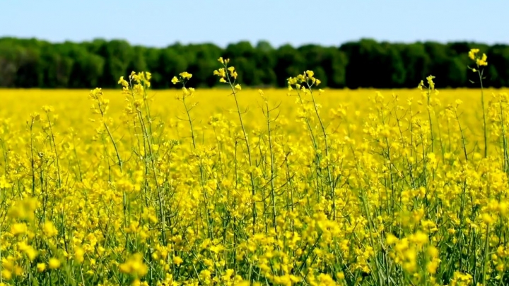 Locomotiva cu abur în câmpul de rapiță